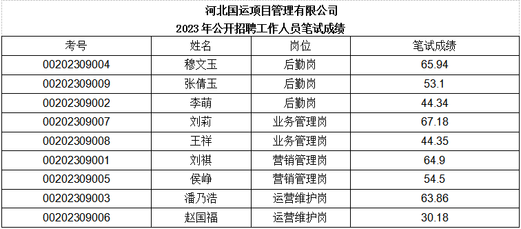 根據(jù)《滄州市安居集團(tuán)有限公司2023年度招聘公告》。于2023年9月14日對符合筆試資格條件的人員進(jìn)行了筆試,現(xiàn)將筆試成績予以公示。