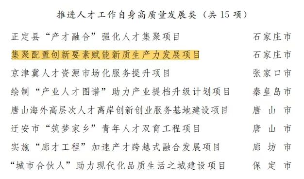 “集聚配置創(chuàng)新要素賦能新質(zhì)生產(chǎn)力發(fā)展”項(xiàng)目聚焦“四個(gè)面向”目標(biāo)導(dǎo)向,突出“引育留用”關(guān)鍵環(huán)節(jié),以集聚海內(nèi)外人才資源要素、全球性高端智力資源、創(chuàng)新性技術(shù)項(xiàng)目資源、指導(dǎo)性數(shù)據(jù)信息資源、支撐性合作渠道資源等五個(gè)方面為主要舉措,旨在打造具有河北特色和全國(guó)影響的招才引智工作品牌,促進(jìn)形成全球人才、智力、技術(shù)等創(chuàng)新要素向河北充分涌動(dòng)的大好局面。